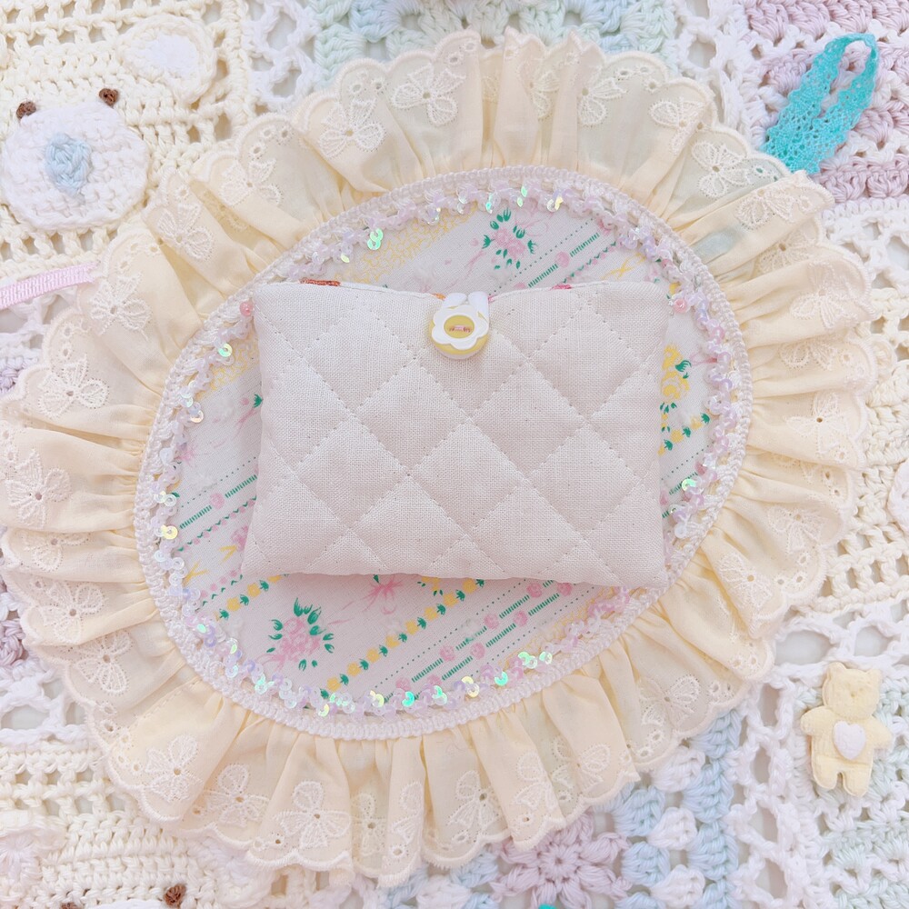 아이보리색 누빔원단에 곰돌이를 달아주었어요.