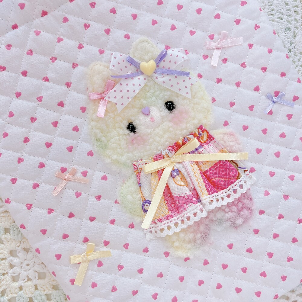 하트무늬가 귀여운 누빔원단에 고양이를 달아주었어요.